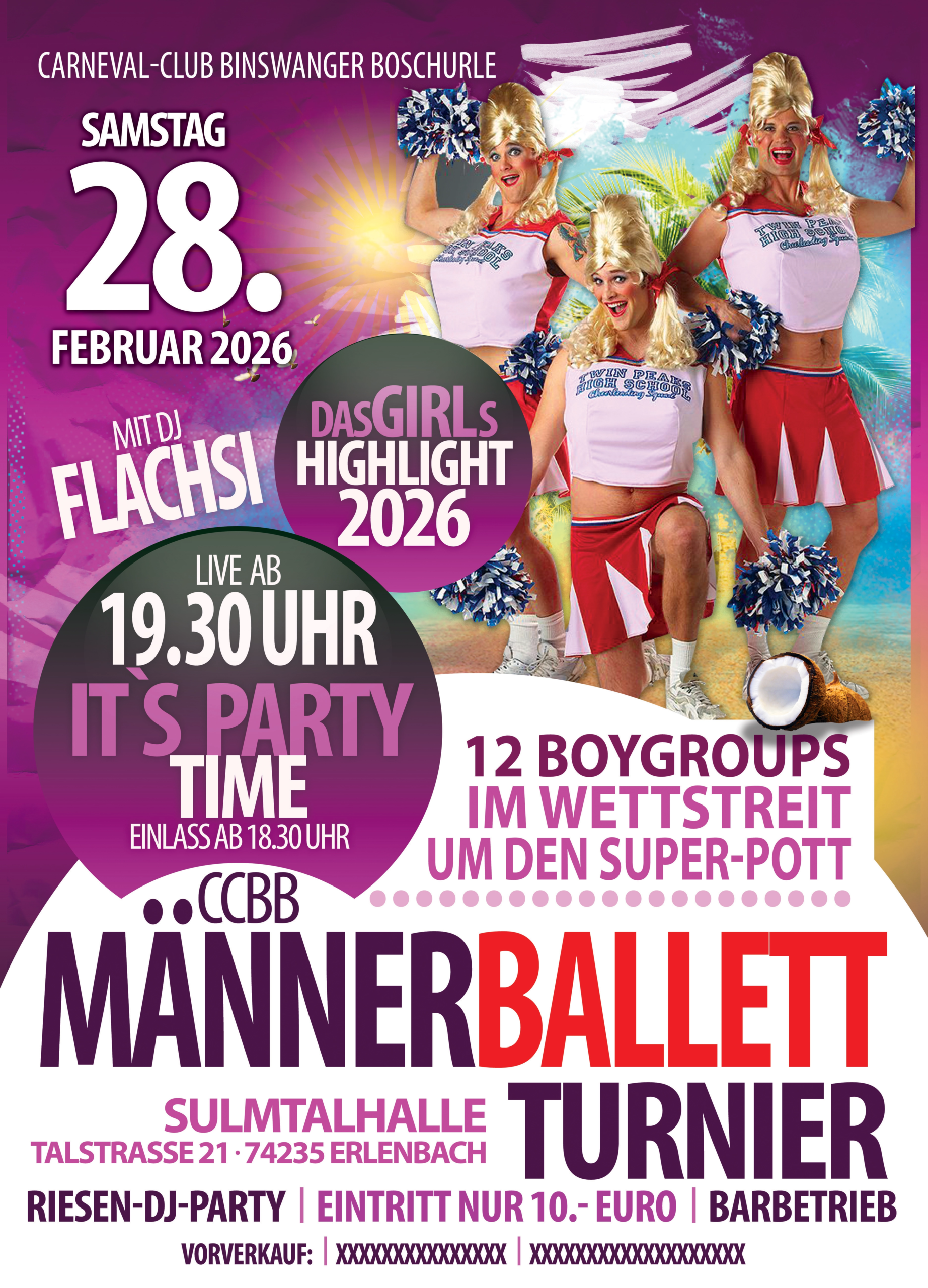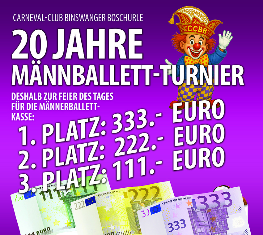 Seit zwei Jahrzehnten heißt es in Binswangen: Raus aus dem Blaumann, rein ins Tutu! Unser Männerballett-Turnier ist mittlerweile älter als manche Tanzschritte unserer Teilnehmer – und definitiv legendärer. Was als Schnapsidee begann (vermutlich auch mit Schnaps), ist heute ein Fest der Körperkunst, des Glitzers und der wackelnden Waden. Jahr für Jahr zeigen mutige Männergruppen aus Nah und Fern, dass Eleganz keine Frage des Trainings ist – sondern der Haltung. Und ein bisschen auch des Bauchumfangs. Wir feiern 20 Jahre Schweiß, Spaß und Spagat-Versuche – und freuen uns schon auf die nächsten! Auf euch, auf uns, auf die Boschurle – und vor allem: auf einen Abend, den keiner so schnell vergisst (auch wenn’s am Tag danach schwer fällt)!
